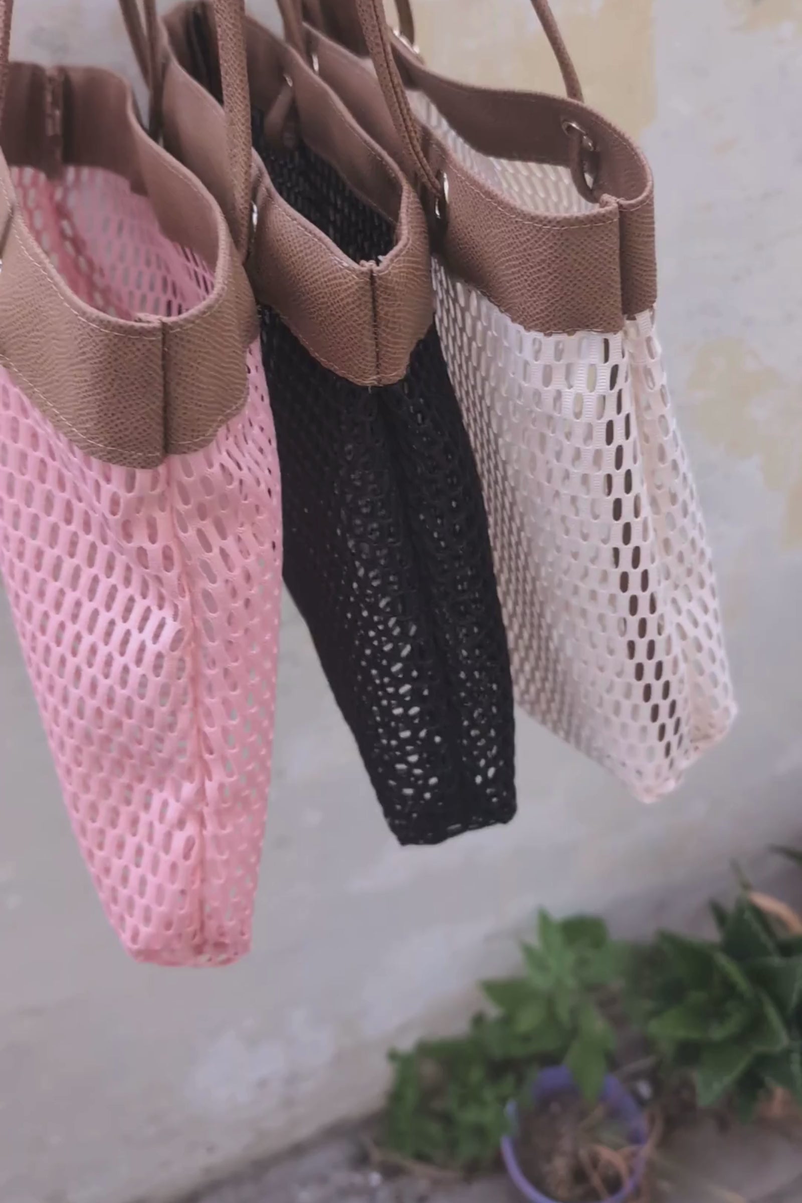 Crafted from breathable, durable mesh with premium vegan leather details, it’s designed to be carried by hand or worn over the shoulder with comfortable straps.